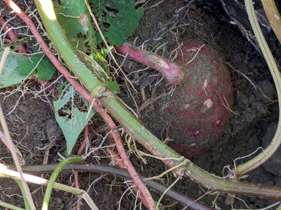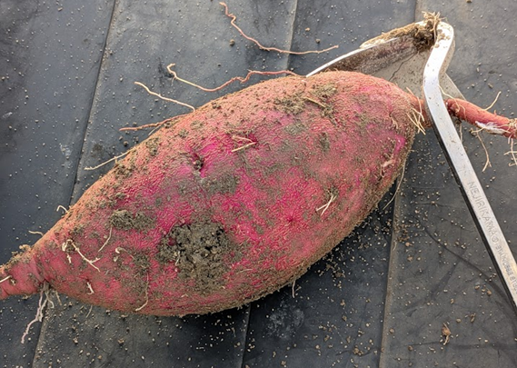 マルチシートを一部やぶって、ちょっと掘ってサツマイモを確認。
